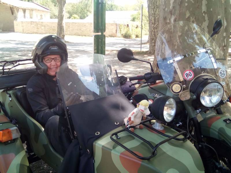 Balade test comportement roulage à deux en direction de Sarrant, vieux village où se trouve une librairie-tartinerie. A connaître.